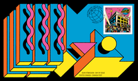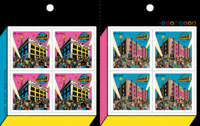 The booklet interior shows groups of four of each stamp, while the booklet back cover repeats the dynamic and dimensional colour blocks prominent in the design of this issue. The buildings that housed the stations are highly stylized to reflect art of the era.