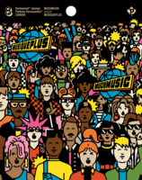 Bright dynamic colours on black, capturing the design style of the 1980s.