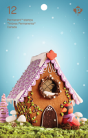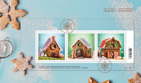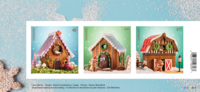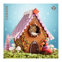 These scrumptious stamps feature elaborately decorated gingerbread houses with all their “creature comforts” – a birdhouse (domestic rate), a doghouse (U.S. rate) and a barn that is the home of Santa’s magical transport team of reindeer (international rate).