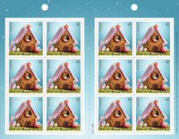 These scrumptious stamps feature elaborately decorated gingerbread houses with all their “creature comforts” – a birdhouse (Permanent™ domestic rate), a doghouse (U.S. rate) and a barn that is the home of Santa’s magical transport team (international rate).