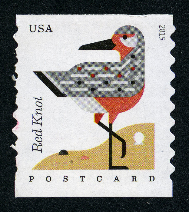 With the release of the Coastal Birds postcard stamps, the U.S. Postal Service® celebrates four eye-catching birds: the red knot (Calidris canutus), king eider (Somateria spectabilis), roseate spoonbill (Platalea ajaja), and magnificent frigatebird (Fregata magnificens).