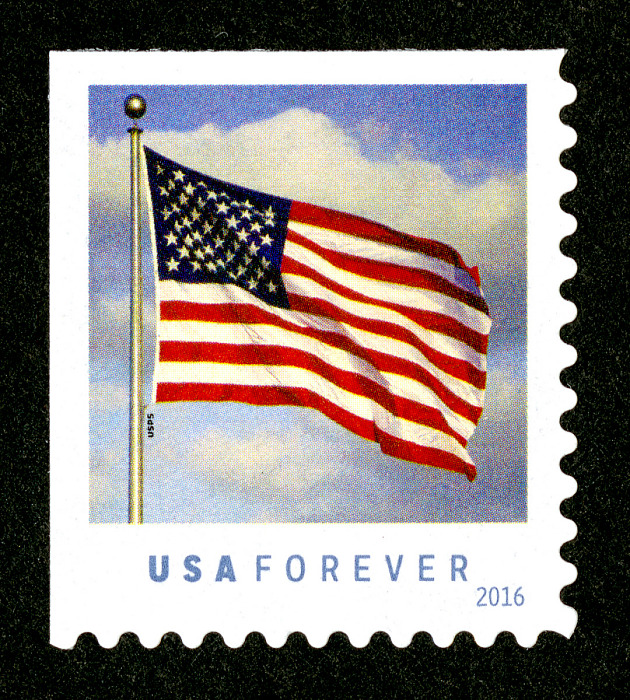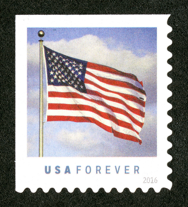 On January 29, 2016, in Washington, DC, the U.S. Postal Service® will issue the U.S. Flag First-Class Mail® stamp (Forever® priced at 49 cents), in one design. The formats available are a pressure-sensitive adhesive (PSA) booklet of 10 stamps produced by security printer Banknote Corporation of America/SSP (SSP), a PSA booklet of 20 stamps produced by security printers Ashton Potter (USA) Ltd (APU) and SSP, and a PSA coil of 100 stampsproduced by security printers APU and SSP. The stamp will go on sale nationwide January 29, 2016.