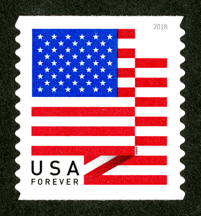 On February 9, 2018, in Ft. Lauderdale, FL, the U.S. Postal Service® will issue the U.S. Flag 2018 First-Class Mail® stamp (Forever® priced at 50 cents) in one design, in a pressure-sensitive adhesive (PSA) booklet of 20 stampsproduced by security printers Ashton Potter (USA) Ltd (APU) and Banknote Corporation of America (BCA), and a PSA Coil of 100 stamps produced by security printers APU and BCA. The stamp will go on sale nationwide February 9, 2018.