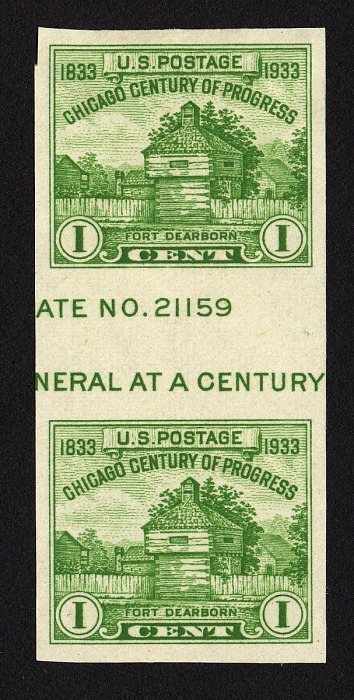 The central design of the 1-cent stamp depicts old Fort Dearborn, pioneer outpost at Chicago, as restored in 1816. A blockhouse of the old fort appears in the foreground, partly overshadowed below and with a stockade fence extending from each side to the edge of the stamp. In the background are trees and other buildings of the fort. In a short ribbon panel at the top of the stamp are the words "U. S. postage" in solid Gothic. On each side opposite the lower edge of this panel are the dates "1833" at the left and "1933" at the right. Above the blockhouse in a curved line are the words "Chicago Century of Progress" in solid Gothic. In each lower corner is a circular panel with light ground and double-line border inclosing the denomination numeral "I" in solid Roman. In a narrow panel with curved ends and solid background at the base of the stamp is the word "Cent" in white Roman. Above the base panel in solid block lettering are the words "Fort Dearborn."