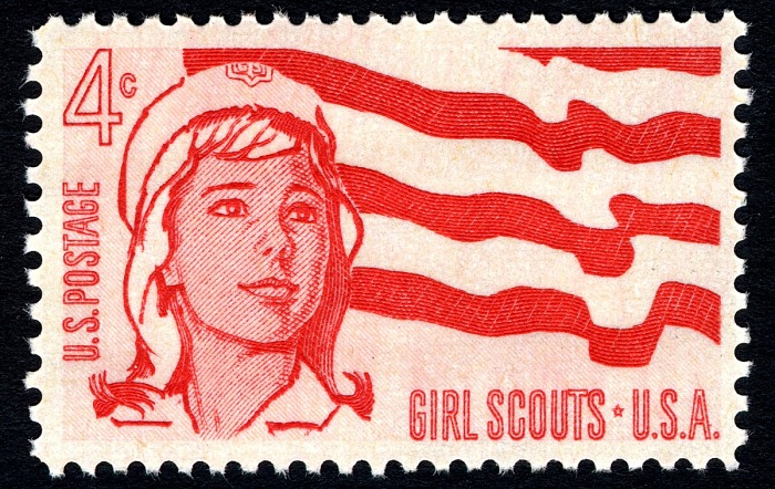 Portrayed on the stamp is an intermediate Girl Scout in uniform, with an American Flag in the background.