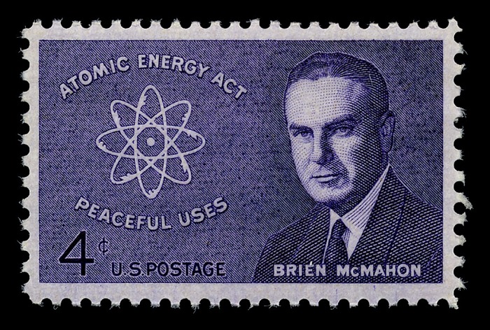 The Department issued the 4-cent Brien McMahon commemorative stamp through the Norwalk, Conn., post office, on July 28, 1962. The stamp was in tribute to the late Connecticut Senator for his role in opening the way to peaceful uses of atomic energy.