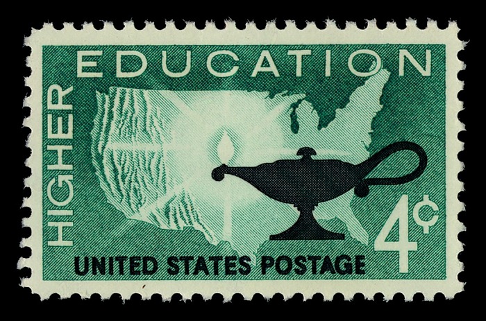 A 4-cent stamp pointing to the role higher education had played in the cultural and industrial development of the United States was first placed on sale at the Washington, D.C., post office, on November 14, 1962. This stamp came as part of the centennial observance of the law creating land-grant colleges and universities and was issued to coincide with the annual meeting of The Association of State Universities and Land-Grant Colleges.
