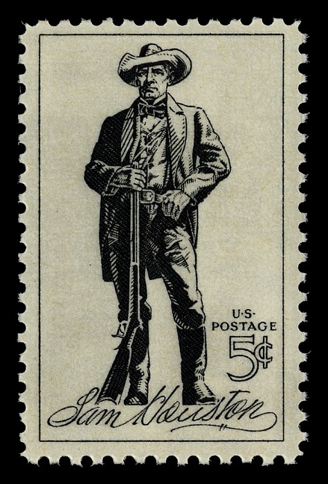 This 5-cent stamp portrays Sam Houston, hero of Texas independence, and was designed by Tom Lea, a famous Texas artist. It is based on an 1848 lithograph by F. Davignon, with Lea depicting Houston a few years younger, as he appeared when he was the first President of the Republic of Texas. Originally scheduled for release on December 13, 1963, in Houston, Texas, the stamp's issue was postponed and rescheduled for January 10, 1964, with nationwide availability beginning January 11.