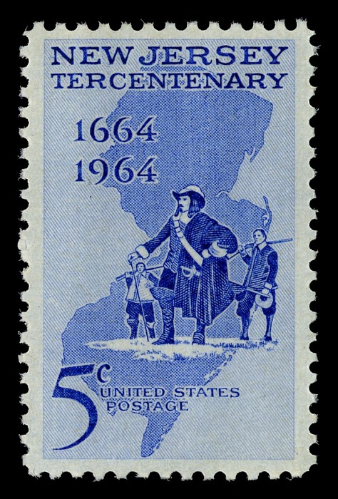 The 5-cent New Jersey Tercentenary commemorative postage stamp was first placed on sale on June 15, 1964, at Elizabeth, N.J., the oldest city in the State.