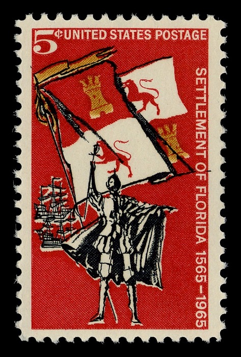 The Department issued the 5-cent stamp commemorating the 400th anniversary of the first continuous permanent European settlement in the New World through the Saint Augustine, Fla., post office on August 28, 1965. A stamp identical in design, except for necessary differences in the caption and denomination, was released simultaneously by Spain.